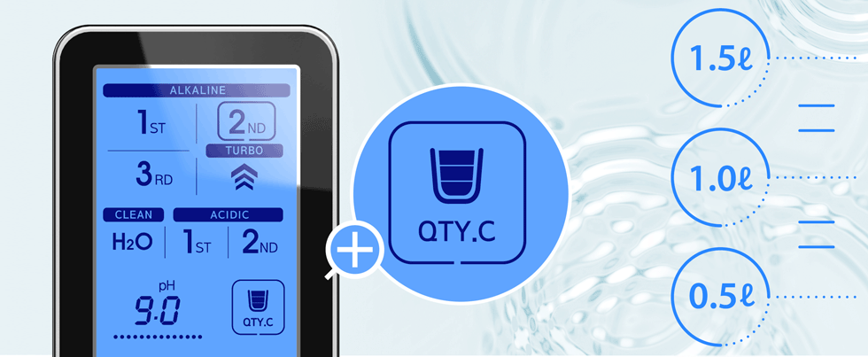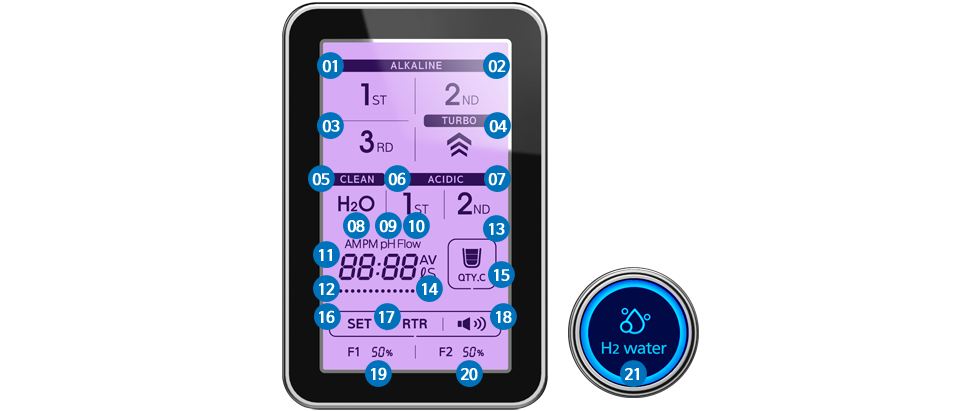 Для вашего удобства ионизатор имеет возможность дозировать заранее определенное количество воды и затем останавливаться. Пресеты включают 0,5 л, 1,0 л и 1,5 л.